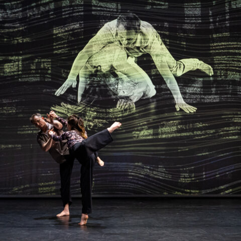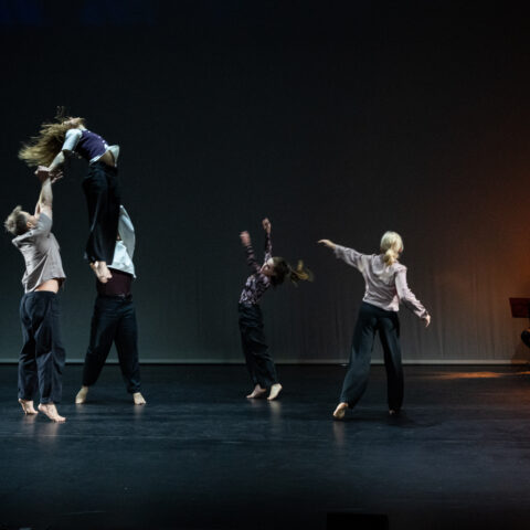 Walking Songs was created through collective collaboration. It brings to the stage a visually striking projection, live music, and dance, blended together in a way that sometimes feels more organic and at other times less so, yet always performed with high artistic quality by dancers and musicians. The performance consists of three parts, each with a distinct poetics and atmosphere. The first part is dominated by metaphorical imagery, supported by movement, projections, and brief verbal reflections by the performers. The second part is playful, featuring brilliantly executed and vibrant interactions between musicians and dancers. The final section highlights the dancers’ interpretative performances, showcasing their virtuosity not only in movement but also in spoken expression. Marta Poláková’s ambitious project fully utilizes the potential of its creators, the spatial and technical possibilities of the Aréna Theatre, and conveys to the audience the necessity of collaboration and the freedom of choice.