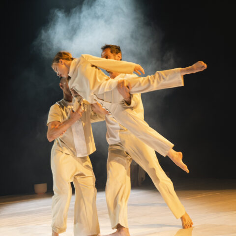 DREAM by choreographer Lucia Holinová and co-author of the concept Zuzana Očenášová-Vasičáková brings stories of dreaming, nightmares, hidden desires, fears, and unfulfilled ideas of the self. Dreams unfold in abstract images, unrestrained and guided by their own logic—an intuitively tuned functionality of absurdity. Into Nina Pixel’s music, the sound resonances of observer-performers playing meditation bowls are interwoven, serving as a kind of commentary. Subtle shifts and nuances in the music accompany gentle ruptures on stage, unpredictable changes in atmosphere. Performers and co-authors of the choreography—Lukáš Bobalik, Katarína Chilli Čillíková, Daniel Raček, and Paulína Šmatláková—bring the best of their diverse dance backgrounds into the intricately crafted movement concept. Their dance transitions into weightlessness with acrobatic ease, only to become fully grounded again in hip-hop sequences or to stir the atmosphere with the drama of expressive movement. Daniel Raček brilliantly takes on the role of mediator. In his solo with a mask (designed by Jozef Kurinec), he encapsulates the multidimensionality of the dream world. Costumes by Veronika Keresztesová, together with lighting design by Róbert Polák, create a magical visual symbiosis, playfully working with unsettling details and provocative contrasts. In her project, Holinová avoids melancholic tones, confidently moving along the fine line between miracles and reality. The fluidity of movement integrates the flow of time, where past, present, and future slip away from the linear axis and play with the viewer’s perception.